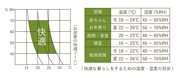 お部屋ごと、また季節によっても快適な温度・湿度は異なります。以下の表が、快適な温度・湿度の目安になります。