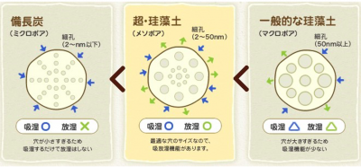 その秘密は、珪稚内珪藻頁岩の微細な孔にあります。顕微鏡で見ると、普通の珪藻土と稚内珪藻土では粒の大きさがまったく違うのです。この稚内珪藻土の微細な孔が、湿気の吸放出に最適な大きさなのだとか。