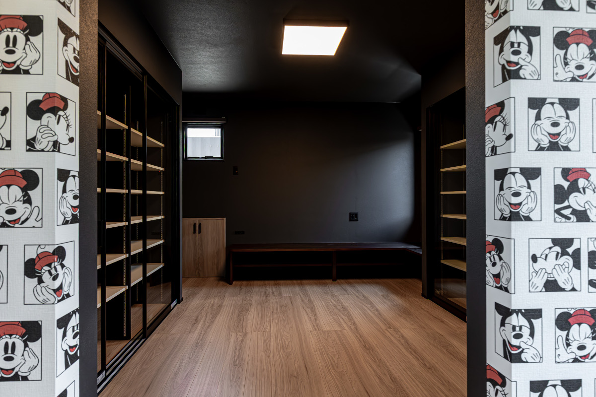 2階の寝室には、お施主さまの好きなミッキーの壁紙を。もうひとつの個室は、趣味の小物を飾るためのカウンター付き趣味室。