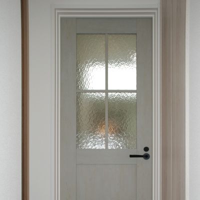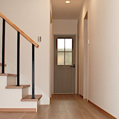 無垢材を使用した床玄関から洗面所までの空間の雰囲気です。そして洗面所の雰囲気や階段から2階へ上がるまでの空間とそこから見るリビングのドアです。