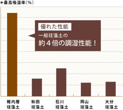 その秘密は、珪稚内珪藻頁岩の微細な孔にあります。顕微鏡で見ると、普通の珪藻土と稚内珪藻土では粒の大きさがまったく違うのです。この稚内珪藻土の微細な孔が、湿気の吸放出に最適な大きさなのだとか。