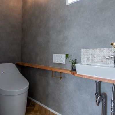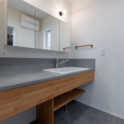 洗面台に使われているグレーは、人気のモールテックス。 ベルギー発、モルタル調の左官材料です。