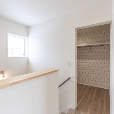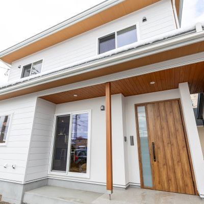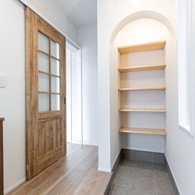 玄関収納はアールの垂れ壁で可愛らしく。外観もホワイトのガルバと板張りの軒天でシンプルに、さわやかに仕上げました。