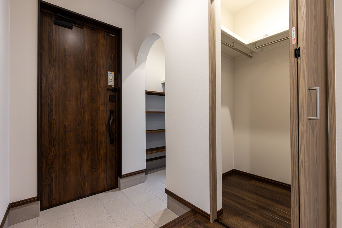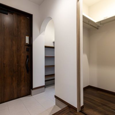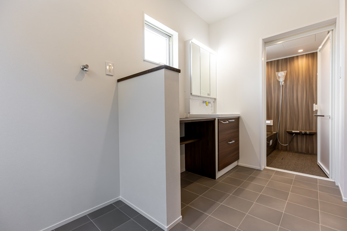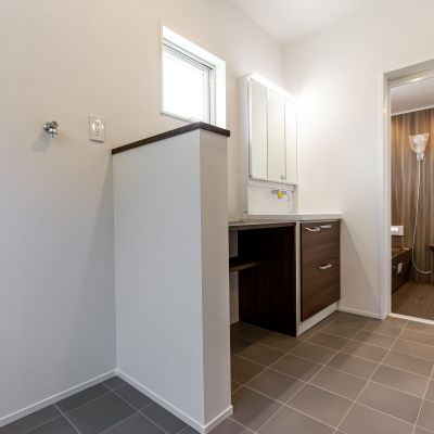 回遊できるラクラク家事動線に、通路部分を利用した階段下収納。4畳分の広いサニタリールームは、洗面・脱衣・ランドリールーム兼用。棚板付きで、洗濯物を「畳む」までが、ここで簡潔します。