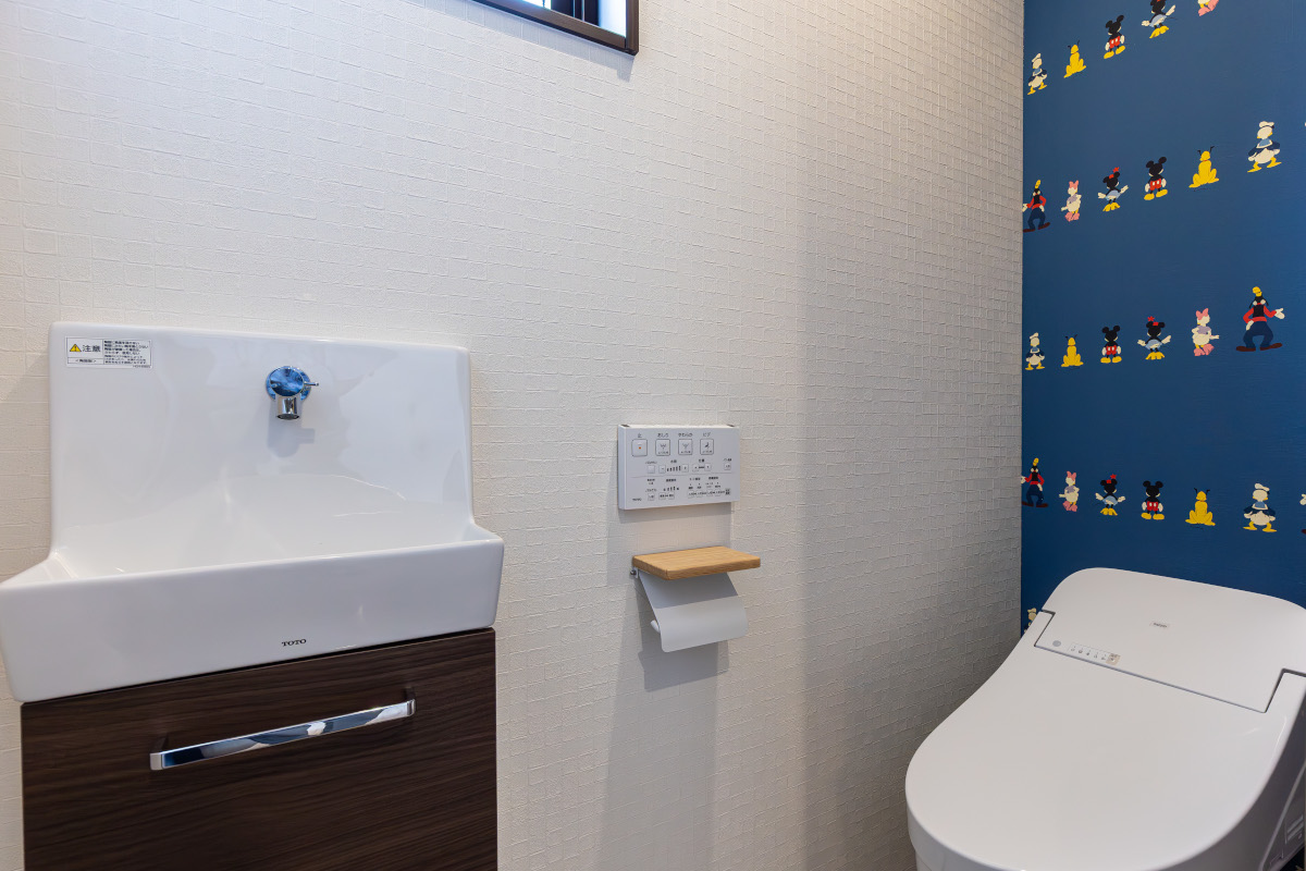 2階の寝室には、お施主さまの好きなミッキーの壁紙を。もうひとつの個室は、趣味の小物を飾るためのカウンター付き趣味室。