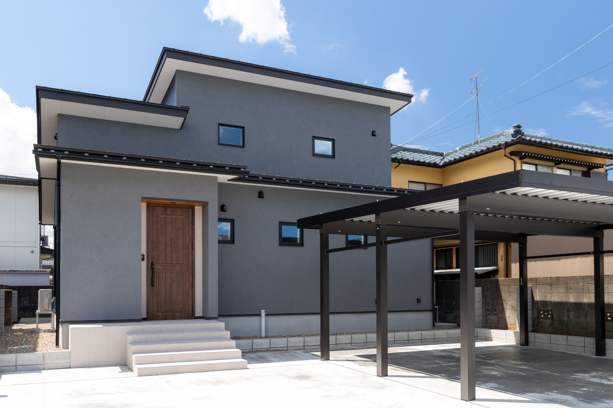 北面はグレーの塗り壁で、シックかつ落ち着いた雰囲気に。