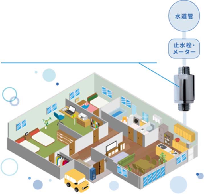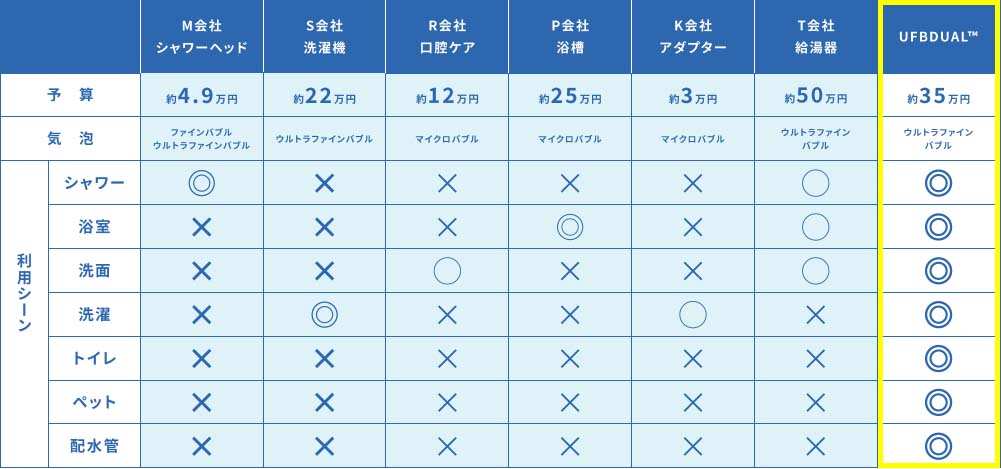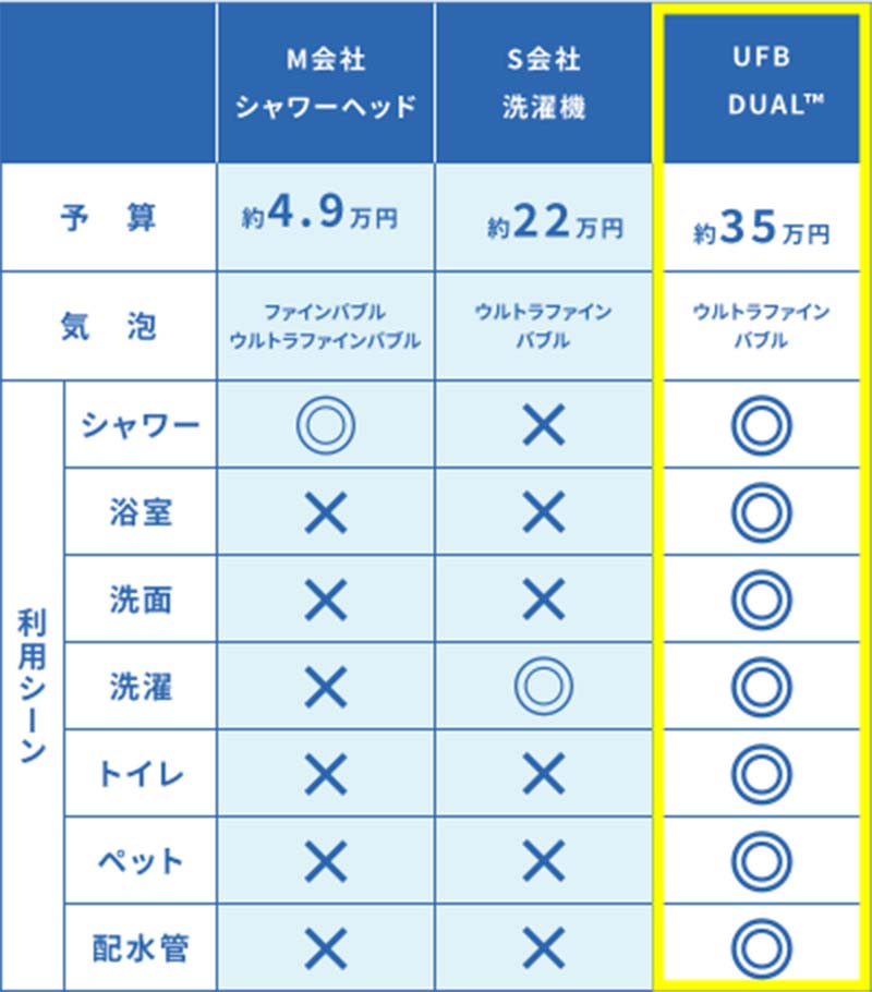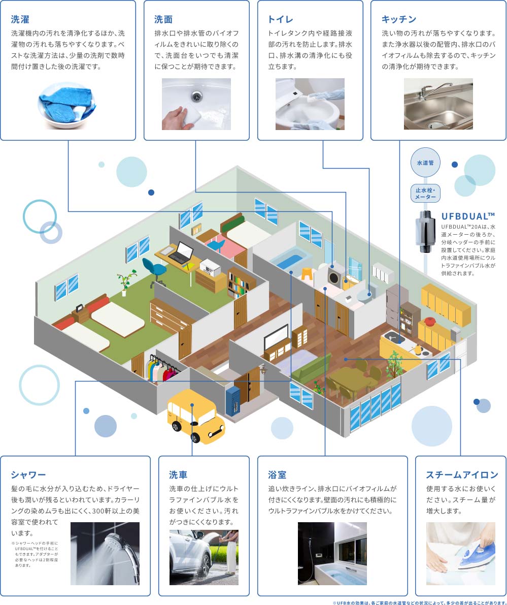 他社製品と違い、UFB DUAL®︎は水道の元栓に取り付けることができるので、浴槽のお湯、キッチンの水道や食洗機、洗濯機、トイレ、庭の水道での洗車など、建物全体の水がウルトラファインバブル水になります